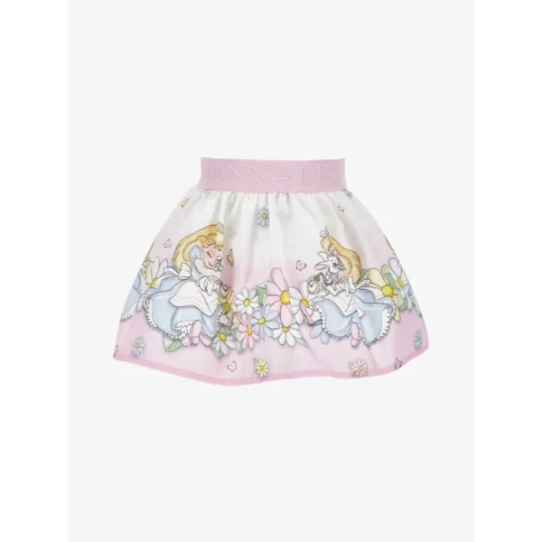De Monnalisa Rok in de kleur Bianco Rosa Fairytale uit de Baby Alice collectie heeft een elastieke tailleband met het logo verwerkt en een print met Alice.
