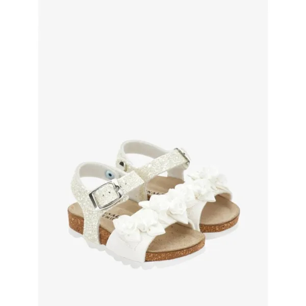 De Monnalisa Sandalen in de kleur Glitter Panna heeft een wit glitterbandje en bloemen. De sandalen kun je verstellen en zijn te combineren met alle themas.