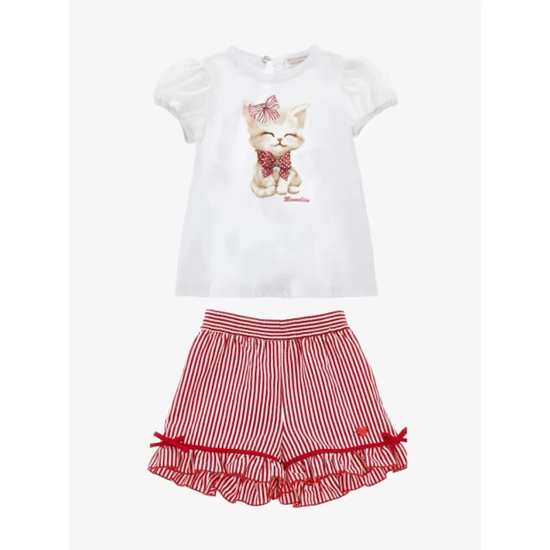 De Monnalisa Set in de kleur Bianco bestaat uit een t-shirt met pofmouw, knoopsluiting op de rug en print met kat. De short heeft een elastieke tailleband, roezels aan de onderkant en strikdetails.