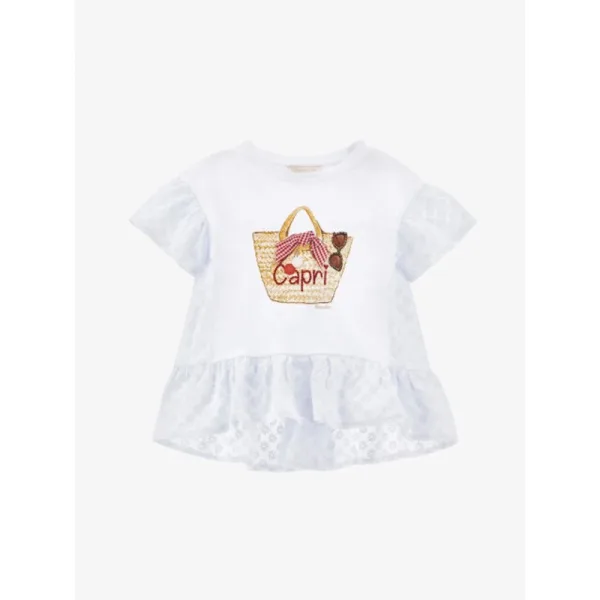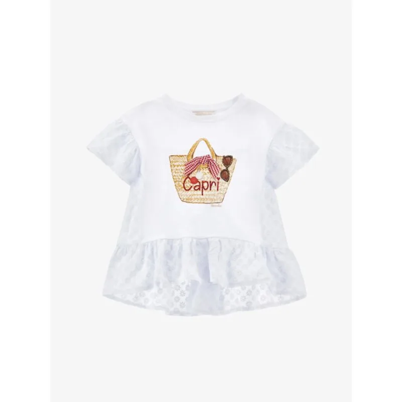Het Monnalisa Maxi T-shirt in de kleur Bianco heeft kanten roezel mouwen en een high low kanten roezel aan de onderkant. Het shirt heeft een strandtas print op de voorkant.