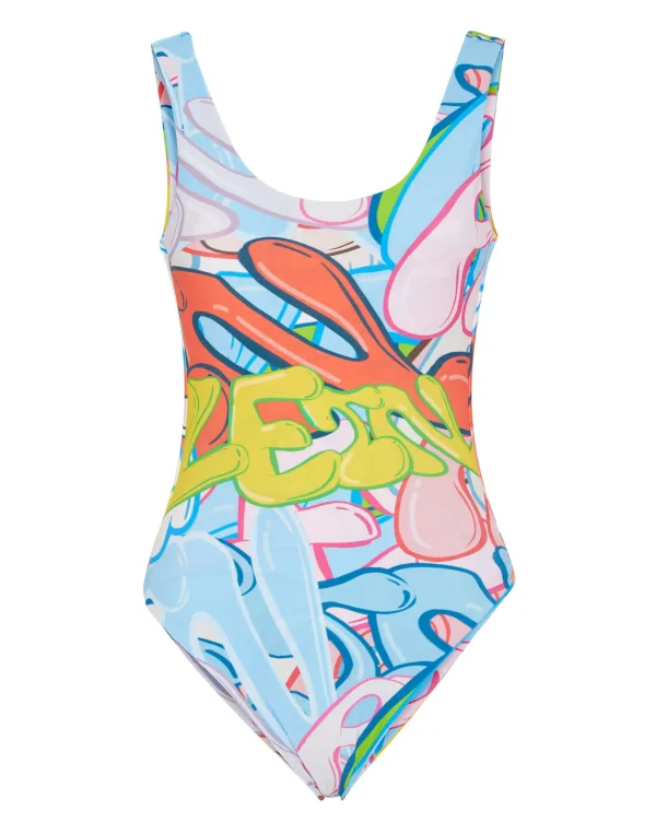 Ontdek de Bombing Graffiti stijl met dit lycra eendelige badpak met themaprint. Lycra met Bombing Graffiti-print Open rug Zomen met twee naalden