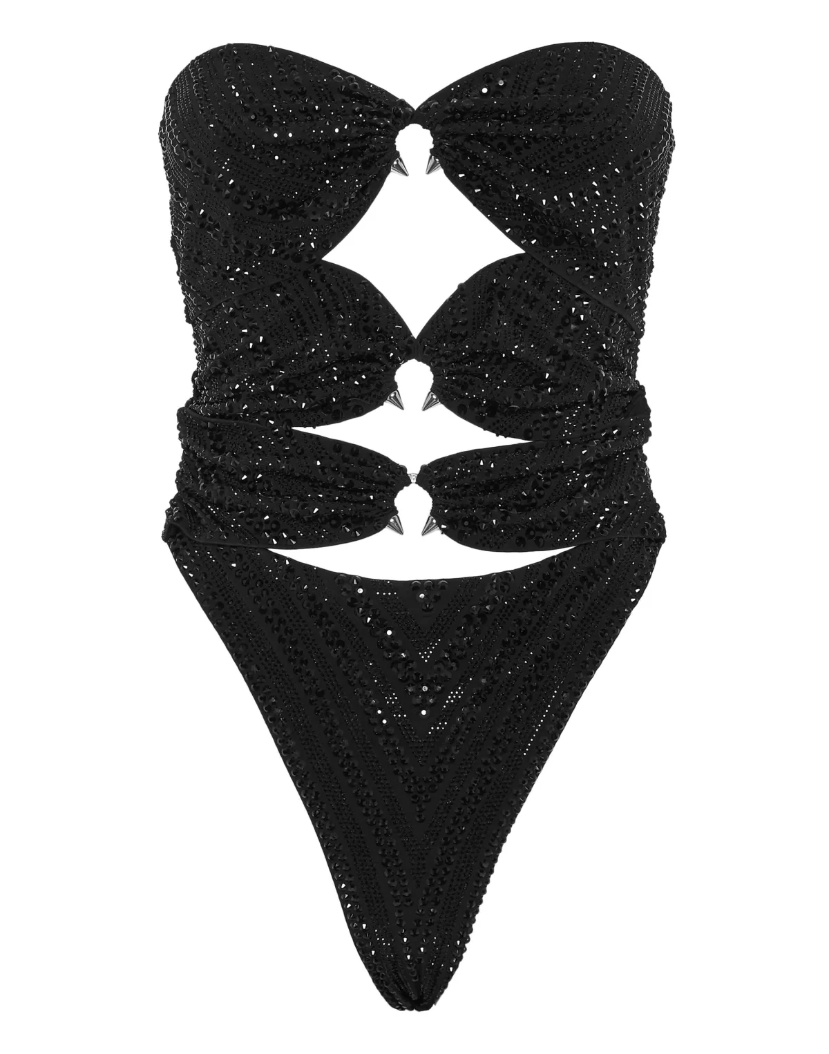 Discover glam style with this monokini made of Lycra® decorated with crystal appliqués. Matching colored rhinestone-encrusted Lycra® Strapless Draped straps on the front tied with jewel piercing rings Tie straps on the back Two needle stitching