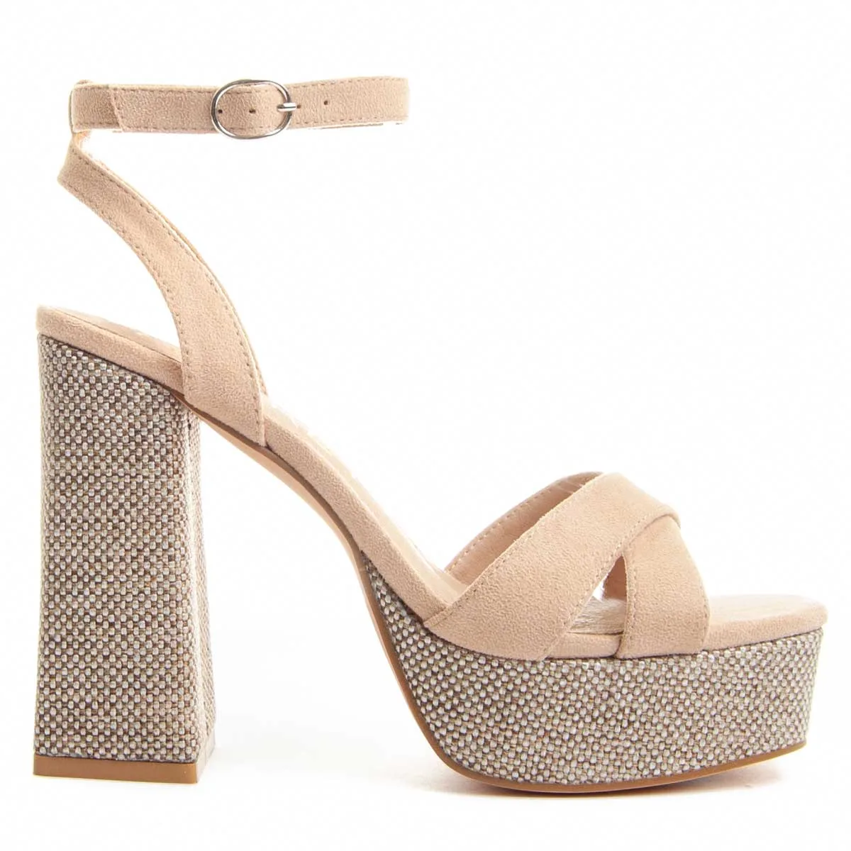 Dames hoge hak sandaal. Gevoerde leren binnenzool. Comfortabele pasvorm. Antislipzool. Versterkte stiksels. Gemaakt door andere merken voor ons merk. Geschatte afmetingen: 13 cm hak en 2 cm platform.