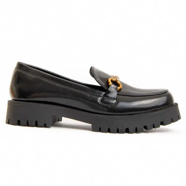 Platte mocassin voor dames. Comfortabele pasvorm. Gevoerde binnenzool van natuurlijk leer. Door andere merken voor ons merk gemaakt. Afmetingen bij benadering: 4 cm hak en 2 cm plateau.