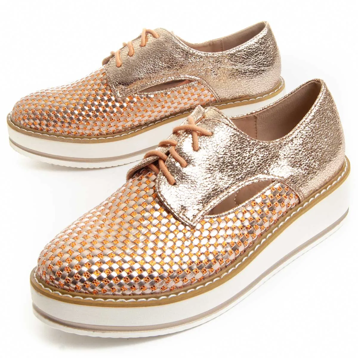 Comfortabele oxford schoen voor dames. Comfortabele pasvorm. Gevoerde binnenzool. Antislip zool. Versterkte stiksels. Vervaardigd door andere merken voor ons merk. Afmetingen bij benadering: 4 cm hak en 3 cm plateau.