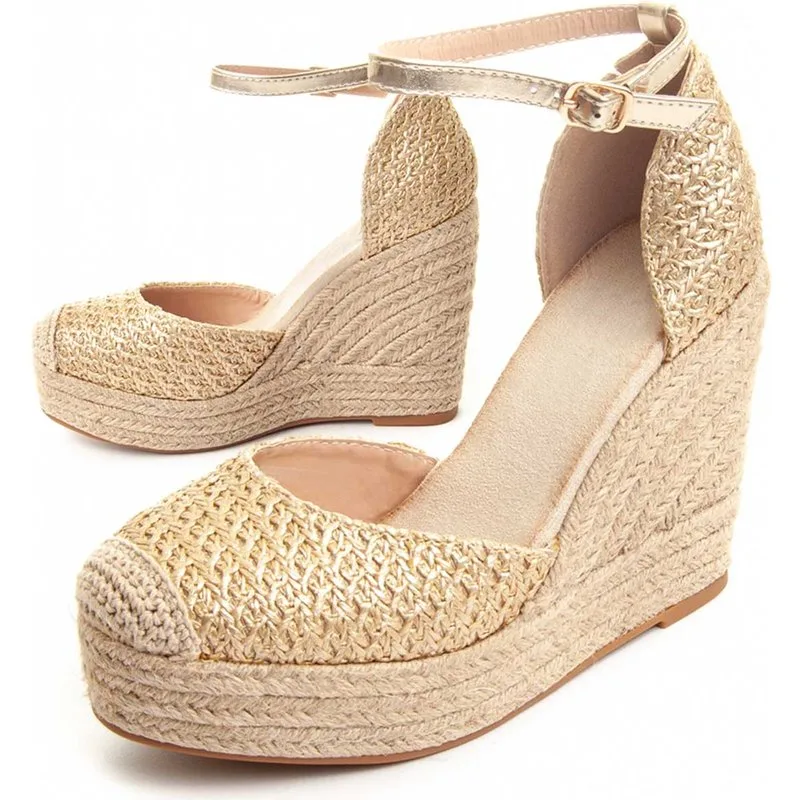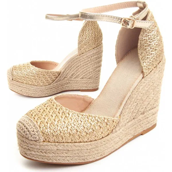Esparto gras wedge voor dames. Comfortabele pasvorm. Gevoerde binnenzool. Antislip zool. Versterkte stiksels. Vervaardigd door andere merken voor ons merk. Afmetingen bij benadering: 12 cm sleehak en 3 cm plateau.