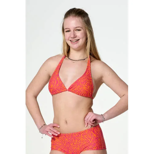 Een triangel bikinitop met een mooie pasvorm. De bikinitop is om meerdere manieren te knopen, en matcht goed met onze bikini broekjes. De bikinitop heeft uitneembare vullingen en is verkrijgbaar in de kleuren zwart en print oranje.