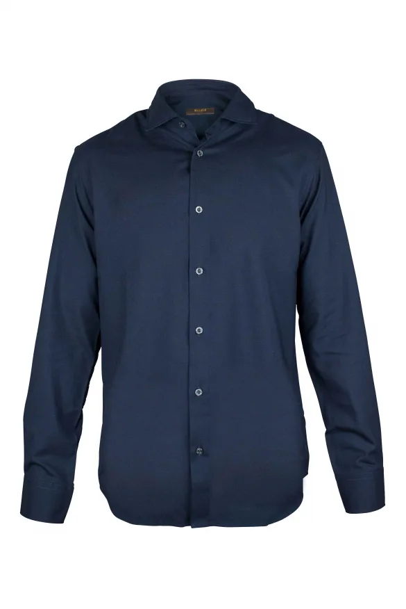 Marineblauw overhemd van Moorer-scheerwol.Lange mouwen.Manchetten met knopen.Parelmoeren knoopsluiting aan de voorkant.Slanke pasvorm.Gemaakt in Italië.