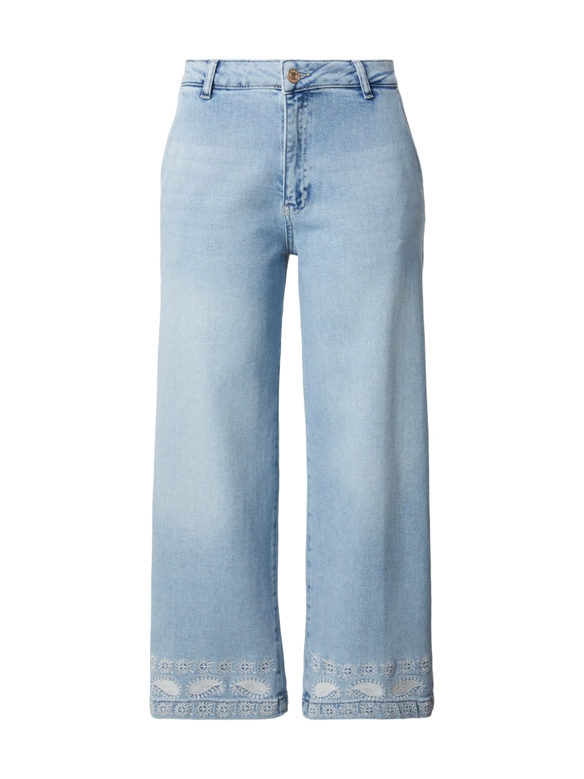 Design: Gevoerde zoom/rand, Ritssluiting, Achterzak, Zakken aan de zijkant; Type sluiting: Ritssluiting; Materiaal: Denim; Motief: Paisley; Details: Borduursels; Extra's: Vaste grip, Riemlussen; Wassing: Light washed; Lengte: 3/4 lengte; Pasvorm: Wide leg; Taillehoogte: Mid waist