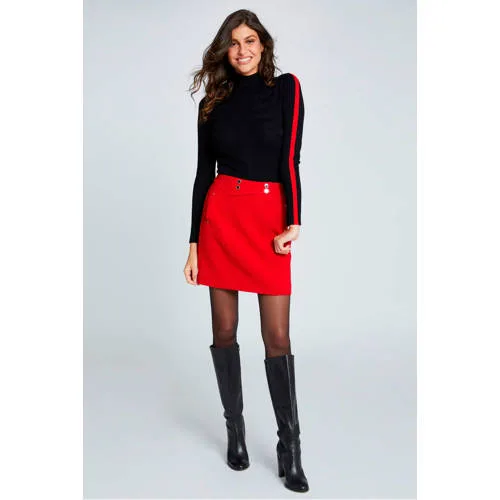 Deze dames coltrui van Morgan is uitgevoerd in een fijngebreide ribkwaliteit met een contrasterende streep op de mouwen. Het model is voorzien van een colkraag en lange mouwen.
