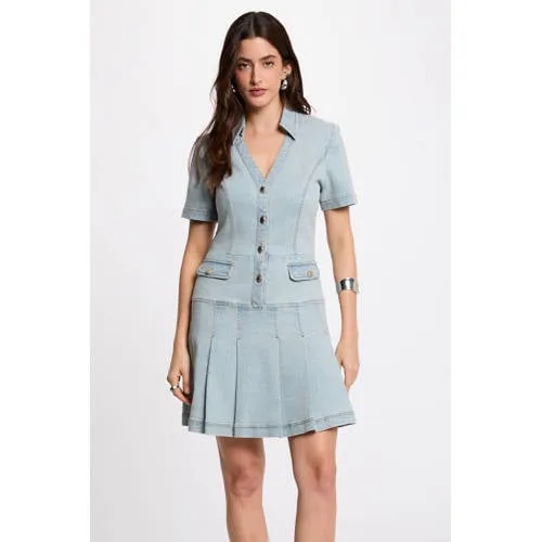 Deze korte denim jurk van Morgan heeft een A-lijn pasvorm en een licht uitlopende rok. De Morgan korte denim jurk is gemaakt van stevig denim in light blue en valt kort boven de knie. Denim jurk met doordachte detailsKorte lengte, geschikt voor warme dagen of met een panty in het tussenseizoenKorte rechte mouwen die de schouders netjes bedekkenKlepdetails met knopen bij de taille die de aandacht naar het smalste punt trekkenPlatte plooien aan de onderkant voor extra beweging in de rokSteekzakken aan de voorkant, praktisch en netjes in het ontwerp weggewerktKleur: light blue denim, eenvoudig te combineren met andere basicsMaatadvies: dit artikel valt klein, kies bij twijfel een maat groterEen korte denim jurk voor elke dagDeze korte denim jurk komt goed tot zijn recht op warme dagen en in het tussenseizoen. Afhankelijk van schoenen en extra laagjes sluit het ontwerp gemakkelijk aan bij zowel informele momenten als meer verzorgde gelegenheden.Morgan: Franse stijl met een moderne twistMorgan staat bekend om eigentijdse collecties met een vrouwelijk silhouet. De ontwerpen volgen de trends, maar blijven tegelijk draagbaar in het dagelijks leven. Zo kies je voor mode die stijl en comfort combineert in jouw garderobe.Een korte denim jurk als deze vormt een veelzijdige basis voor uiteenlopende outfits gedurende het seizoen.