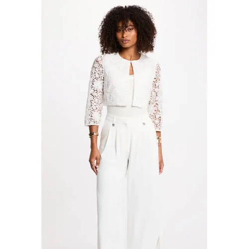 Deze Morgan cropped bolero met guipure kant geeft elke outfit direct meer structuur en finesse. Het korte, aangesloten model legt het accent op de taille en laat jurken en high waisted broeken mooi uitkomen. Guipure kanten inzetten met een subtiele bloemenstructuur zorgen voor een verfijnde, moderne uitstraling, terwijl de ronde hals en half lange mouwen het geheel rustig en evenwichtig houden.Kenmerken van de kanten bolero Cropped bolero voor een kort, modern silhouet Getailleerde snit die de taille benadrukt Ronde hals en 3/4 mouwen voor een vrouwelijke lijn Guipure kant met bloemendessin voor een verfijnd effect Haaksluiting middenvoor voor een nette afwerking Gemaakt van polyester, vormvast en onderhoudsvriendelijk Zonder zakken voor een strakke, cleane look Valt klein volgens maatadviesGestylde looks met de boleroDeze bolero past goed over een nauwsluitende jurk, waarbij de korte lengte de taille accentueert. Ook boven een vloeiende, high waisted broek met een fijne top komt het korte jasje mooi tot zijn recht.Morgan: moderne Franse stijlMorgan staat bekend om vrouwelijke collecties met een eigentijdse, stadse uitstraling. Het merk werkt met doordachte pasvormen en details die je garderobe makkelijk combineren, van kantoor tot diner. Zo voeg je met één kledingstuk eenvoudig variatie toe aan bestaande outfits.Een kort jasje dat zorgt voor een verzorgd accent bij zowel dagelijkse als meer formele looks.