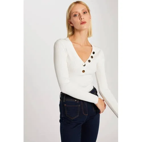 Deze trui voor dames van Morgan de Toi is gemaakt van een viscosemix. Het model heeft een V-hals en lange mouwen.details van deze trui:sierknopen