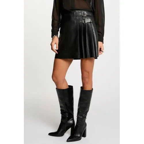 Deze Morgan rok is een mini rok gemaakt van imitatieleer. De rok heeft een kleur en een gesp als sluiting. Met plooien voor een speels effect, geschikt voor veel gelegenheden.