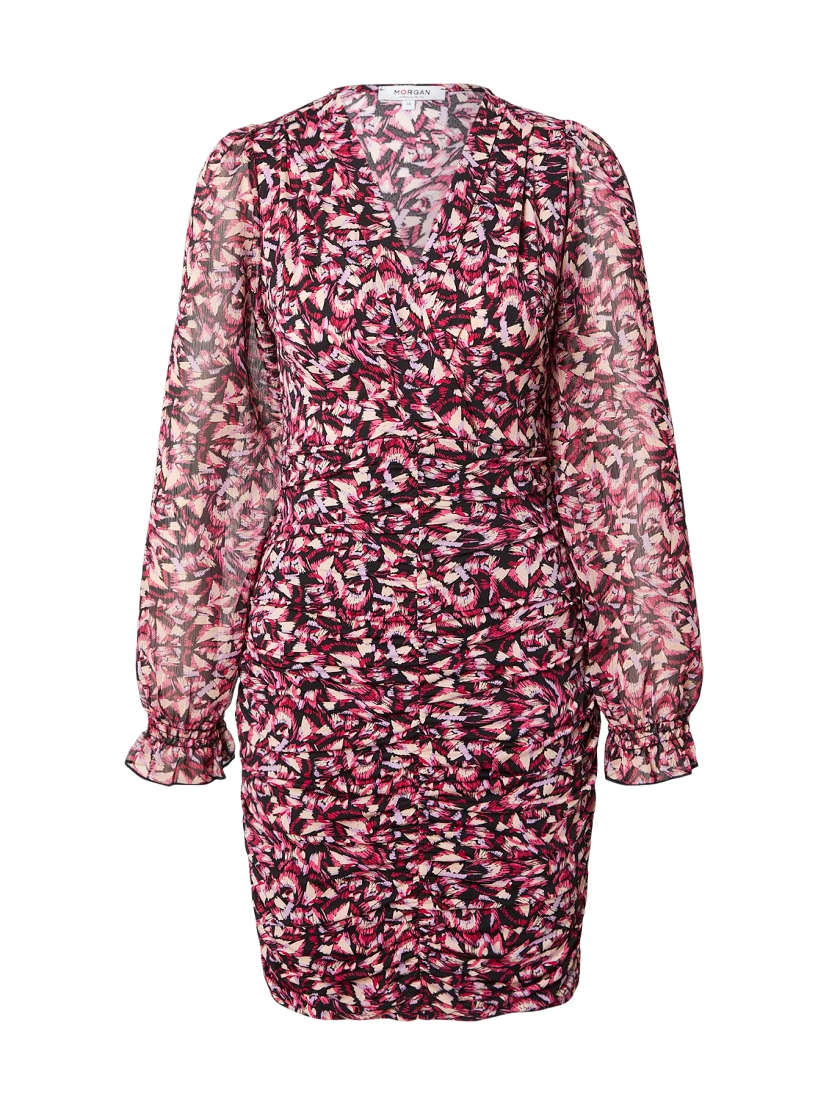 Design: Gevoerde zoom/rand, Pofmouwen, Diepe snit/decolleté, Elastische inzetstukken; Halstype: V-hals; Details: Ruches, Gedrapeerd; Extra's: All-over patroon, Lichte stof; Lengte: Kort/mini; Snit: Getailleerd; Pasvorm: Slanke pasvorm; Armlengte: Lange mouw