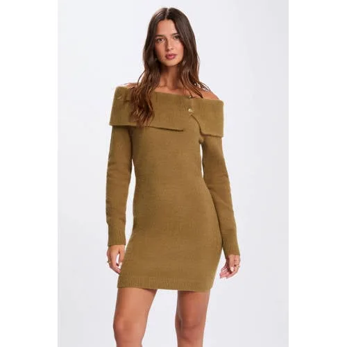 Deze Morgan jurk heeft lange rechte mouwen en een off shoulder kraagvorm. De jurk komt tot boven de knie, is gemaakt van polyester en heeft sierknopen en een split aan de voorkant.