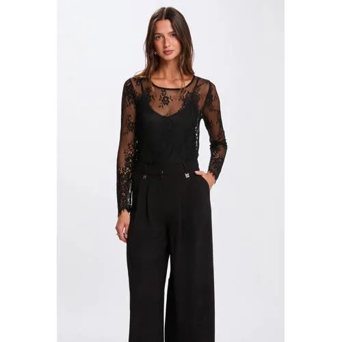 Deze Morgan kanten top dames geeft je garderobe een rustige, kanten basic waarmee je eenvoudig varieert. De rechte snit volgt de lijn van het lichaam en zorgt voor een nette uitstraling, terwijl de opengewerkte kantstructuur een semi-transparant effect laat zien. Met lange mouwen en een ronde hals is dit T-shirt geschikt voor zowel overdag als in de avond. Gemaakt van 100% polyamide kant voelt de stof licht aan en sluit aan op het lichaam zonder strak aan te voelen.Kenmerken van deze kanten top Rechte pasvorm die het lichaam omhult zonder strak te zitten Ronde hals die de halslijn rustig laat ogen Lange, rechte mouwen met semi-transparante afwerking Opengewerkt kant met effen dessin voor een duidelijke structuur Gemaakt van 100% polyamide kant voor een licht en soepel draaggevoel Geen zakken, zodat de kantstructuur ononderbroken blijft Valt relatief smal, kies bij twijfel een maat groter voor extra bewegingsruimteGeschikt voor werk en vrije tijdDeze kanten top is geschikt voor verschillende momenten op de dag. De combinatie van lange mouwen en kant maakt het model passend voor kantoor, een etentje of een andere gelegenheid waarbij je er verzorgd uit wilt zien. Door de rechte snit laat de top zich eenvoudig inpassen in zowel meer casual als meer geklede outfits.Morgan met aandacht voor pasvorm en detailsMorgan richt zich op moderne mode met aandacht voor vorm en afwerking. De nadruk ligt op pasvorm, materiaalkeuze en kleine details die het ontwerp compleet maken. Deze kanten top sluit daarop aan door de rechte snit, het opengewerkte kant en de keuze voor licht, comfortabel materiaal.Een kanten top die soepel aansluit bij uiteenlopende dagen en momenten.