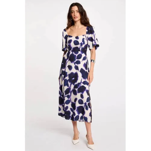 Deze Morgan jurk heeft korte wijde mouwen en een vierkante hals. De elastische inzet zorgt voor een prettige pasvorm. De jurk valt op door het smockwerk en heeft een midi lengte.