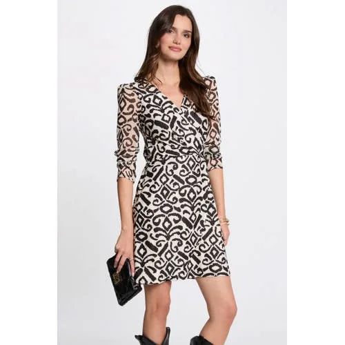 Design: Gevoerde zoom/rand; Halstype: V-hals; Details: Wikkel design; Extra's: All-over patroon, Fijne stof; Lengte: Kort/mini; Pasvorm: Normale pasvorm; Armlengte: Lange mouw