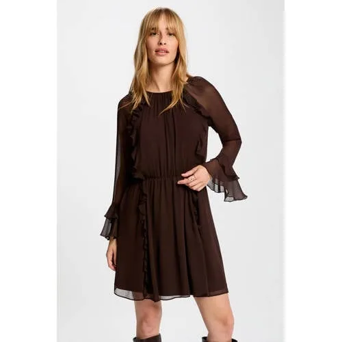 Voor een moderne, vrouwelijke look is deze korte Morgan jurk een praktische keuze. De uitlopende snit benadrukt het bovenlichaam en zorgt dat de rok soepel meebeweegt, terwijl de mini lengte de benen zichtbaar laat. De donkerbruine kleur maakt het een geschikt item voor zowel overdag als in de avond.Verfijnde details en draaggemak Korte jurk met uitlopende snit voor een A-lijn silhouet Ronde hals en lange trompetmouwen voor een vloeiend geheel Vloeiende stof van polyester met semi-transparante details Elastische tailleband die licht aansluit en vorm geeft Ruches en plooien voor subtiele structuur en een luchtige uitstraling Effen donkerbruine kleur die eenvoudig te combineren is Zonder zakken voor een slank en rustig beeld Maatadvies: dit artikel valt klein, veel draagsters kiezen een maat groterGeschikt voor verschillende momentenDeze mini jurk kan gedragen worden bij uiteenlopende gelegenheden, van een etentje tot een dag in de stad. De lengte, de uitlopende mouwen en de ruches geven de jurk een karakteristieke uitstraling die past bij zowel informele als meer aangeklede settings.Morgan, eigentijdse Franse stijlMorgan staat voor een Franse signatuur waarin moderne lijnen en verfijnde details samenkomen. Het merk richt zich op hedendaagse kleding die prettig te dragen is en een nette, verzorgde indruk maakt, passend bij een dynamische levensstijl.Een jurk die licht aanvoelt, soepel meebeweegt en gemakkelijk een vaste plek in je garderobe krijgt.