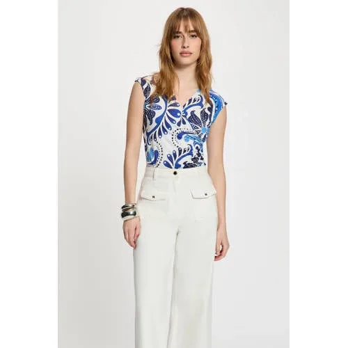 Vul je zomergarderobe aan met deze mouwloze dames top met paisleyprint van Morgan. De top valt aansluitend langs het lichaam en heeft een V-hals die het bovenlichaam subtiel accentueert. De ecru/blauwe paisleyprint geeft een moderne uitstraling, geschikt voor zowel werk als vrije tijd. De soepele stretchstof beweegt prettig met je mee en laat de pasvorm goed tot zijn recht komen.Aansluitende top met zomerse details Aansluitende pasvorm die de vorm volgt en netjes blijft ogen Mouwloos model, fijn voor warme dagen of onder een blazer Ecru/blauwe paisleyprint voor een opvallend dessin V-hals die het decolleté licht accentueert zonder te diep te vallen Zachte, soepele stretchstof met 7% elastaan voor extra bewegingsvrijheid Geschikt voor de zomerperiode en dagelijks gebruik Let op: dit artikel valt klein, kies bij twijfel een maat groterMakkelijk combineren van casual tot chicVoor een casual look combineer je deze top met een soepelvallende broek en platte sandalen. Mag het wat gekleder, dan past een hoge taille rok met pumps erbij. Ook onder een lichte blazer of denim jacket komt de print duidelijk naar voren.Morgan: Franse stijl voor elke dagMorgan biedt collecties met een vrouwelijke snit en aandacht voor details. De ontwerpen sluiten aan bij het dagelijkse leven, van kantoor tot een avond uit. Met deze top haal je een item in huis dat moderne stijl combineert met praktisch draaggemak.Een veelzijdige zomertop waarmee je in weinig tijd een complete outfit samenstelt.