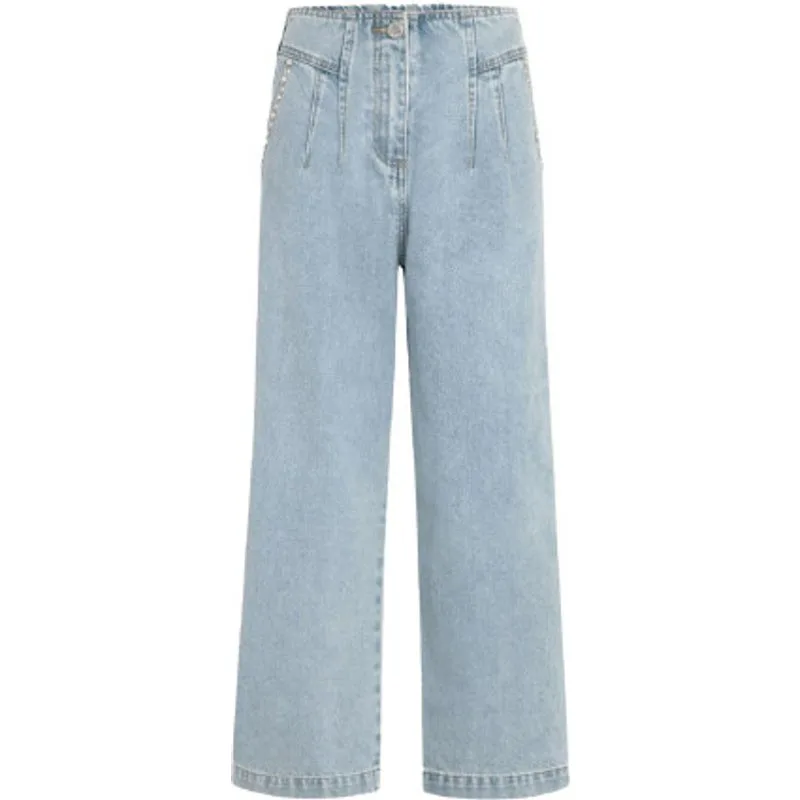 De Paqua jeans van MORGAN DE TOI is een cropped jeans met wijde pijpen. De jeans heeft een hoge taille met elastiek aan de achterzijde, rits- en knoopsluiting en heeft 2 iteliaanse zakken aan de voorzijde en 2 opgestikte zakken aan de achterzijde. De zakken van deze broek zijn afgewerkt met studdetails. Dit model is uitgevoerd in de kleur Light Blue. De stof is gemaakt van Cotton en Polyester.