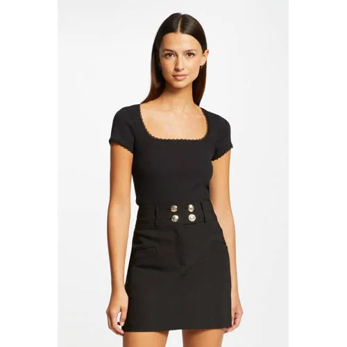 Deze top voor dames van Morgan de Toi is gemaakt van stretchkatoen. Het model heeft een vierkante hals en korte mouwen.details van deze top:rib gebreidkanten details