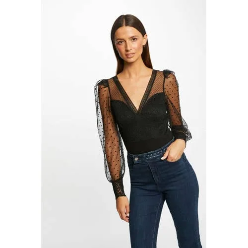 Deze body voor dames van Morgan de Toi is gemaakt van een polyamidemix. Het model heeft een V-hals en lange mouwen.details van deze top:• semi-transparant