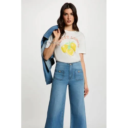 Dit witte T-shirt van Morgan is een praktische basis voor elke dag. De rechte pasvorm en ronde hals zorgen voor een eenvoudige uitstraling, terwijl de print in wit/geel een modern accent geeft. Het zachte materiaal met 50% katoen en 50% modaal voelt soepel aan op de huid, ideaal voor lange dagen op kantoor, in de stad of op vakantie. Dit dames T-shirt met print is makkelijk te combineren en past moeiteloos in je dagelijkse garderobe.Belangrijkste kenmerken op een rij Rechte pasvorm voor een ontspannen, nette uitstraling Ronde hals en korte mouwen, geschikt voor het voorjaar en de zomer Printopdruk in wit/geel voor een frisse uitstraling Gemaakt van 50% katoen en 50% modaal, voelt zacht en soepel aan Onderdeel van de 'Daily' collectie, ideaal voor alledaags gebruik Maatadvies: dit artikel valt klein, kies bij twijfel een maat groter Onderhoud: wassen op 30°C fijnwas, niet in de droger, laag strijken tot maximaal 110° zonder stoomCasual chic combinerenVoor een casual en nette combinatie draag je het T-shirt met een wijde high-waist jeans en een denim jasje. Wil je een wat vrouwelijkere combinatie die toch ontspannen blijft, dan kun je het dragen met een vloeiende rok en een gestructureerde tas. Dankzij de rechte mouwen valt het T-shirt recht langs de armen en blijft je outfit luchtig.Franse stijl van MorganMorgan staat bekend als Frans modemerk met aandacht voor vrouwelijke details en actuele trends. De collecties worden ontworpen voor moderne vrouwen die graag verzorgd voor de dag komen, zonder dat het ingewikkeld hoeft te zijn. Met dit T-shirt haal je een veelzijdig en betrouwbaar item in huis dat je vaak uit de kast zult pakken.Een dagelijkse basic waarmee je eenvoudig een verzorgde outfit samenstelt.