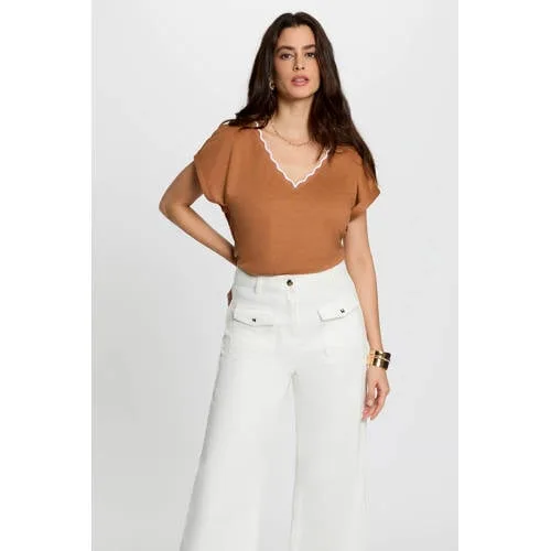 Deze Morgan dames top met korte mouwen geeft je dagelijkse outfits een rustige, verzorgde uitstraling. De rechte snit valt losjes langs het lichaam en voelt prettig aan, zodat de top mooi meebeweegt zonder strak te zitten. De kleur 'Argan Oil' is een warme cameltoon die eenvoudig te combineren is met andere items in je garderobe.Verzorgde details voor elke dag Rechte pasvorm die harmonieus valt rond verschillende silhouetten V-hals die de halslijn subtiel accentueert Korte, rechte mouwen voor een luchtig gevoel Zacht, soepel breisel met melée-effect voor een levendige structuur Contrastbies langs de hals voor een verfijnde afwerking Onderdeel van de Morgan 'Daily' collectie, geschikt voor elke dag Valt klein, een maat groter bestellen wordt geadviseerdVan kantoor tot vrije tijdDeze top combineert makkelijk met een broek met hoge taille en wijde pijpen voor een ontspannen, maar nette look. Voor een meer aangeklede stijl draag je de top onder een getailleerd jasje met een geplooide midi-rok. Dankzij de rustige kleur en het soepele materiaal voelt de top de hele dag comfortabel aan.Morgan: Franse elegantie voor alledagMorgan staat bekend om vrouwelijke mode met een moderne, stedelijke uitstraling. De collecties zijn ontworpen om makkelijk te combineren te zijn, zodat je met weinig moeite een verzorgde look samenstelt. Met deze top haal je een betrouwbaar basisitem in huis waar je het hele seizoen plezier van hebt.Een veelzijdige dagelijkse favoriet die je garderobe rustig en stijlvol aanvult.