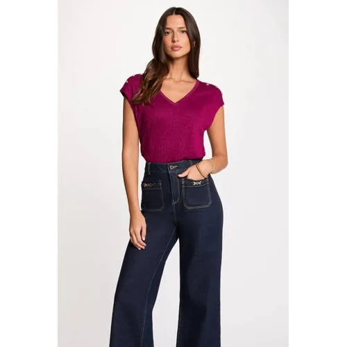 Deze donkerpaarse dames top met V-hals van Morgan is een basic voor elke dag. De rechte pasvorm valt soepel langs het lichaam en de korte mouwen maken het een praktische keuze voor het voor- en najaar. Door de effen kleur is de top makkelijk te combineren, terwijl de sierknopen en subtiele glitters zorgen voor een verzorgde uitstraling.Verfijnde details voor elke dag Rechte pasvorm die comfortabel valt en makkelijk te stylen is V-hals die de halslijn duidelijk laat uitkomen Korte mouwen met rechte inzet voor een rustige look Sierknopen aan de voorkant voor een extra accent Lurex en glitters geven het breisel een zachte, glanzende touch Effen donkerpaarse kleur die goed past bij zowel lichte als donkere onderstukken Gemaakt van een soepele viscosekwaliteit met fijn breisel Maatadvies: dit artikel valt klein, bij twijfel is een maat groter aan te radenStyling van kantoor tot dinerVoor een zakelijke combinatie draag je deze top met een broek met wijde pijpen en sandalen met hak. Ook bij een gestructureerde midi-rok en enkellaarsjes valt de glans van het breisel extra op. De top laat zich makkelijk dragen onder een blazer of los op een high-waist jeans.Het karakter van MorganMorgan is een Frans merk dat zich richt op kleding met aandacht voor details. De collecties sluiten aan bij een moderne, stedelijke levensstijl en bieden items die geschikt zijn voor zowel werk als vrije tijd. Verwacht doordachte pasvormen, herkenbare accenten en stijlen die je garderobe meerdere seizoenen aanvullen.Een veelzijdige top die van een eenvoudige outfit snel een verzorgde combinatie maakt.