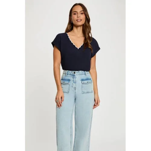 Voor een verzorgde basis in je garderobe is deze Morgan top met korte mouwen een veelzijdige keuze. De rechte pasvorm valt soepel langs het lichaam en volgt je silhouet zonder strak te zitten. De diepe V-hals en de korte, rechte mouwen geven een moderne, vrouwelijke uitstraling die past bij zowel werk als vrije tijd. De zachte, licht soepele stof met melée structuur oogt subtiel en voelt prettig aan op de huid. De top is uitgevoerd in tijdloos marineblauw en heeft een fijne contrastbies die het ontwerp net iets extra’s geeft.Kenmerken van de top Rechte snit die veel verschillende lichaamstypen flatteert V-hals die de halslijn mooi laat uitkomen Korte, rechte mouwen voor een rustige, moderne look Marineblauwe kleur met melée effect en contrastbies Zachte, soepele stof die prettig aanvoelt Onderdeel van de Morgan Daily collectie, ideaal voor elke dag Valt klein, een maat groter kan gewenst zijnStylen voor elke dagVoor een ontspannen daglook combineer je de top met een broek met hoge taille, wijde pijpen en platte sandalen. Voor een meer geklede outfit draag je de top onder een getailleerd jasje, met een geplooide midi-rok en een gestructureerde tas. Zo wissel je eenvoudig tussen casual en meer gekleed.Morgan, Franse vrouwelijkheid in je kastMorgan staat bekend om zijn eigentijdse, vrouwelijke stijl met een duidelijke link naar de Franse stadse mode. De collecties combineren toegankelijke trends met draagbare modellen voor elke dag. Zo voeg je met deze top gemakkelijk een stijlvol en betrouwbaar basisstuk toe aan je garderobe.Een fijne keuze als je zoekt naar een dagelijkse top die moeiteloos meebeweegt met jouw plannen.