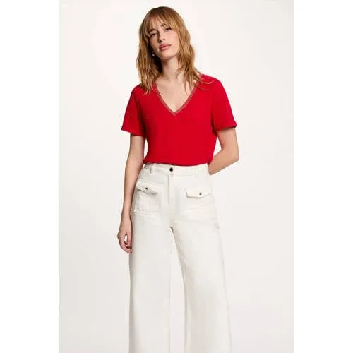 Dit rode linnen T-shirt voor dames van Morgan is een basic voor elke dag met een vrouwelijke uitstraling. De rechte snit valt soepel langs het lichaam en de V-hals geeft je halslijn een zachte, open look. Korte mouwen en een subtiele contrastbies zorgen voor een rustige, verzorgde stijl die makkelijk te combineren is met je bestaande garderobe.Kenmerken van deze rode top Rechte snit die niet strak aansluit en prettig valt V-hals voor een open halslijn Korte, rechte mouwen voor een luchtig gevoel Effen rode kleur die direct opvalt Gemaakt van 55% linnen met een soepele touch voor een koele, ademende feel Contrast bies als subtiel detail langs de hals of randen Onderdeel van de Morgan Daily collectie, geschikt voor alledaags gebruik Maatadvies: dit artikel valt klein, kies bij twijfel een maat groterZo draag je deze Morgan topVoor een dagelijkse look combineer je dit T-shirt met een gestructureerde short en sandalen. Liever iets gekleder, maar nog steeds makkelijk? Dan past deze top goed bij een vloeiende midi-rok met een tas in een rustige kleur. De effen kleur maakt stylen eenvoudig, van casual tot meer gekleed.Morgan: Franse flair in je dagelijkse outfitsMorgan ontwerpt kleding met een vrouwelijke, eigentijdse stijl die goed aansluit op het dagelijks leven. De collecties combineren modieuze details met draagbare modellen, zodat je er verzorgd uitziet zonder in te leveren op comfort. Met deze top haal je een praktische basis in huis waar je vaak naar zult grijpen.Een rode top die makkelijk te combineren is met verschillende outfits in je garderobe.