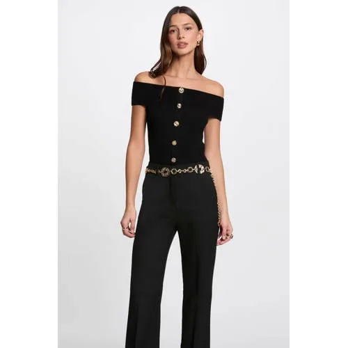 Dit mouwloze dames top van Morgan is gemaakt van viscose. De top heeft een off shoulder kraag en sierknopen. Het valt klein, we raden aan om een maat groter te bestellen. Dit fijn gebreide ontwerp heeft geen zakken.