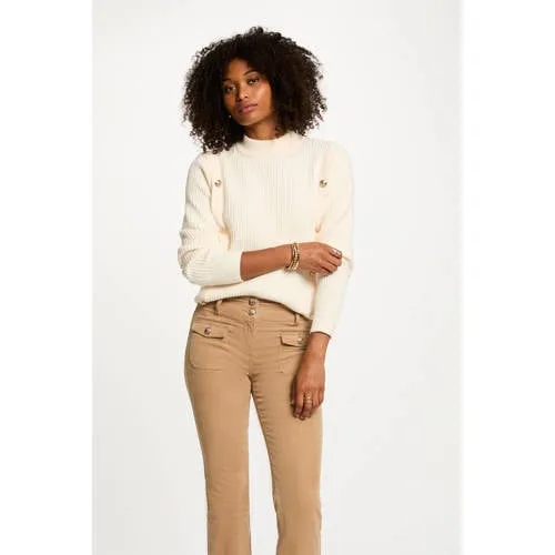 Deze trui komt uit de collectie van Morgan met lange rechte mouwen en een opstaande kraag. De trui is rib gebreid en heeft sierknopen.
