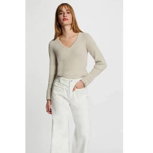 deze trui van Morgan heeft een v-hals en lange mouwen. dit item is fijn gebreid en heeft sierknopen, een omslagdetail en is gemaakt van polyamide met een beetje polyester en metaaldraad.