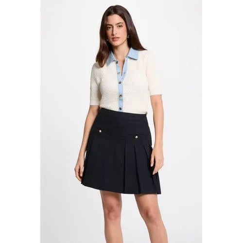 Geef je outfit een stijlvolle basis met dit Morgan vest met korte mouwen. Het vest heeft een korte, getailleerde snit die mooi aansluit op het lichaam en daardoor goed combineert met zowel hoge broeken als rokken. De kraag met revers en de knoopsluiting aan de voorkant geven een verzorgd, bijna jasje-achtig effect, terwijl het ribgebreide materiaal voor een comfortabele pasvorm zorgt.Kort vest met denim details Kort, getailleerd model dat de taille accentueert Kraag met revers voor een nette, gestructureerde look Knoopsluiting aan de voorkant met denim inzetstukken rondom knopen en halslijn Korte, rechte mouwen die de armen subtiel bedekken Rib gebreid voor een soepele, aansluitende pasvorm Gemaakt van PES 47%, VI/CV 33% en PA 20% In effen kleur, eenvoudig te combineren met andere items Zonder zakken voor een slank silhouet Valt klein, een maat groter kiezen wordt geadviseerdMakkelijk te stylen in verschillende looksDit vest draag je als licht laagje over een top of hemdje, of direct op de huid voor een strakke look. De korte lengte komt goed tot zijn recht op een taillebroek, een denim rok of over een jurkje. De denim details zorgen voor een subtiel accent dat past bij casual en smart casual combinaties.Morgan: stijlvolle items met oog voor detailMorgan staat bekend om vrouwelijke, modieuze ontwerpen met doordachte details. Dit vest past daar goed bij, dankzij de combinatie van een getailleerde pasvorm, nette afwerking en moderne accenten. Zo voeg je eenvoudig een verzorgd item toe aan je garderobe.Een compact, veelzijdig vest dat je kledingkast op een toegankelijke manier aanvult.