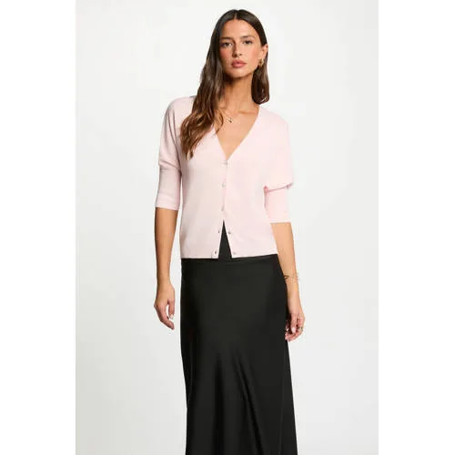 Dit vest van Morgan heeft driekwart mouwen en een V-hals met knoopsluiting. Dit vest is gebreid en gemaakt van wol. Je draagt dit vest makkelijk op een rok of jeans.