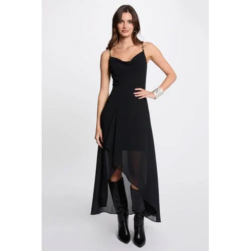 Deze Morgan jurk van polyester heeft spaghettibandjes en een v-hals. De jurk valt asymmetrisch, heeft sierbandjes en is semi-transparant. Met ritssluiting, uitgevoerd in een marine kleur en valt tot op de middel.
