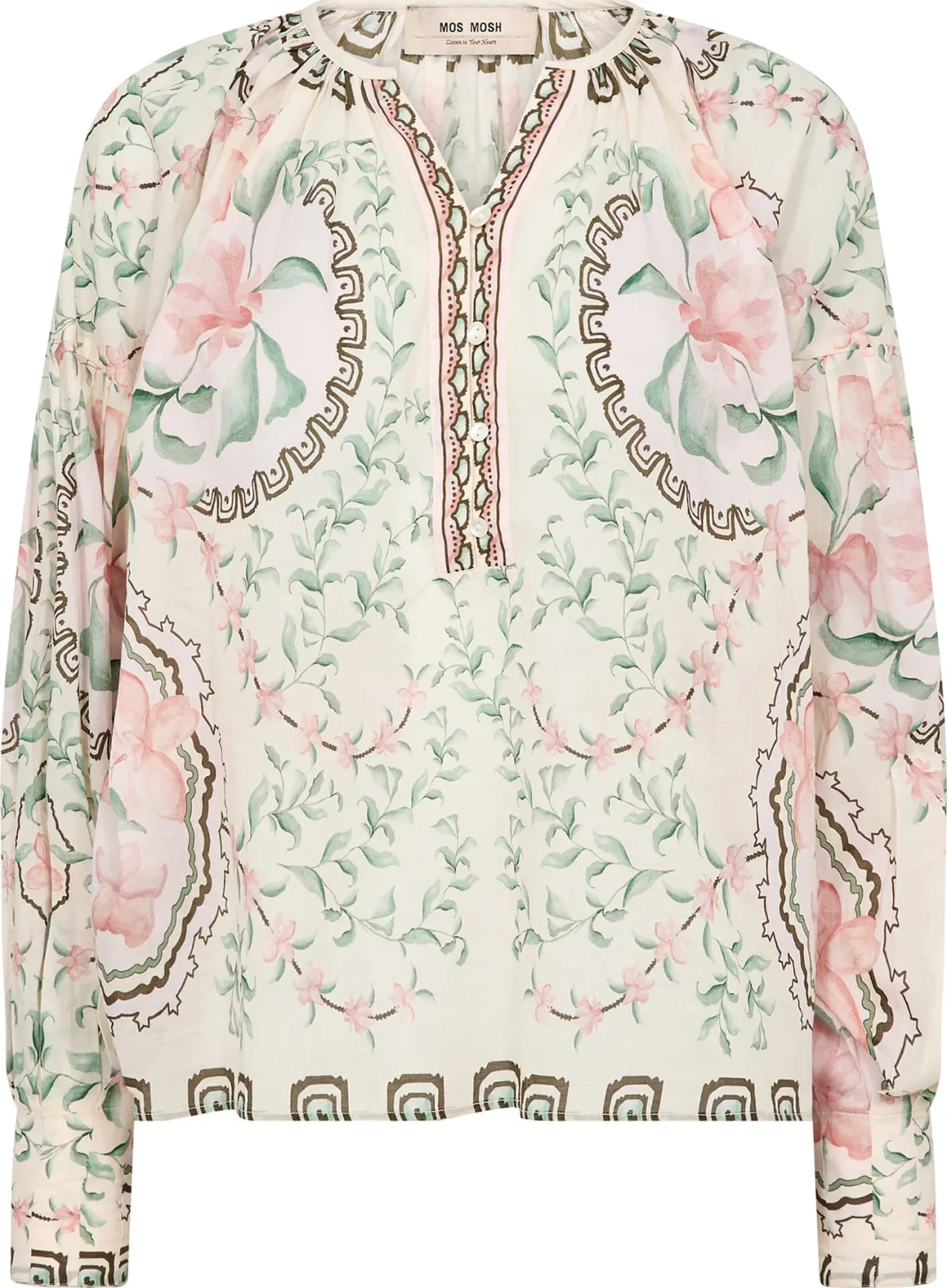 Blouse Wylde van Mos Mosh is een bohemian, feminine item met V-hals, aanschuifsluiting en lange mouwen. De losse pasvorm valt soepel, het bloemenpatroon met sierboorden geeft detail. Draag met een jeans voor een casual outfit, of combineer met een rok.