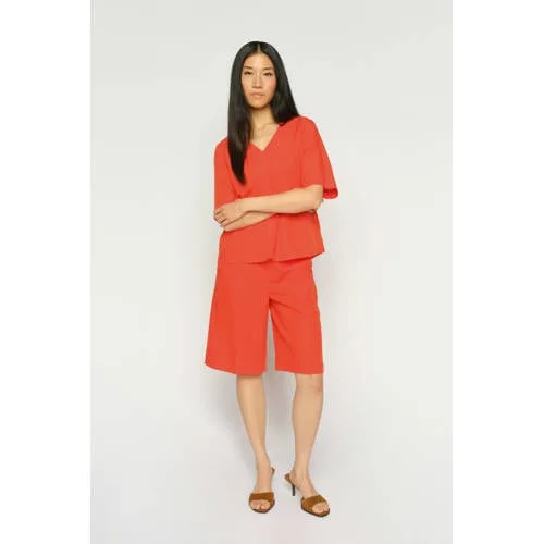 Geef je zomergarderobe kleur met deze oranje dames short van Mos Mosh. De short heeft een high waist, een losse pasvorm en een middellange pijp, waardoor hij relaxed valt zonder vorm te verliezen. De combinatie van 75% TENCEL™ Lyocell en 25% linnen voelt luchtig aan en maakt dit een fijne keuze voor warme dagen, op vakantie of gewoon thuis.Comfortabele zomershort met high waist Losse pasvorm met middel lange pijpen voor een ontspannen uitstraling High waist met elastische inzet aan de achterkant voor extra draaggemak Effen oranje kleur die makkelijk te combineren is met basic T-shirts en tops Zijzakken voor een praktische en nonchalante look Gemaakt van 75% TENCEL™ Lyocell en 25% linnen, voelt zacht en luchtig aan op de huidCasual combineren in het dagelijks levenDeze short past goed bij een eenvoudige tanktop, een losse blouse of een lichte trui voor frisse avonden. Sneakers, sandalen of slippers eronder en je outfit is klaar. Ideaal voor zomerse dagen in de stad, een terrasje of een ontspannen weekend.Mos Mosh stijl en kwaliteitMos Mosh staat bekend om tijdloze items met een moderne, vrouwelijke pasvorm. De focus ligt op fijne materialen, doordachte details en kleding die je makkelijk in je dagelijkse garderobe opneemt. Zo voeg je met deze short een betrouwbaar en stijlvol basisstuk toe aan je kast.Een frisse, comfortabele short waar je de hele zomer plezier van hebt.