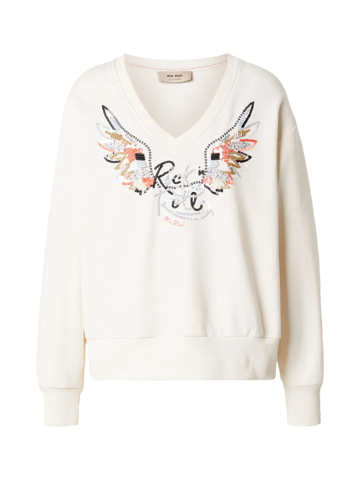 Design: Rechte zoom, Geribd ceintuurtje, Overcut schouder; Materiaal: Sweatstof; Halstype: V-hals; Motief: Tekst print; Details: Pailletten, Borduursels; Extra's: Op staal naden, Voelt zacht aan; Pasvorm: Losse pasvorm; Armlengte: Lange mouw; Lengte: Normale lengte