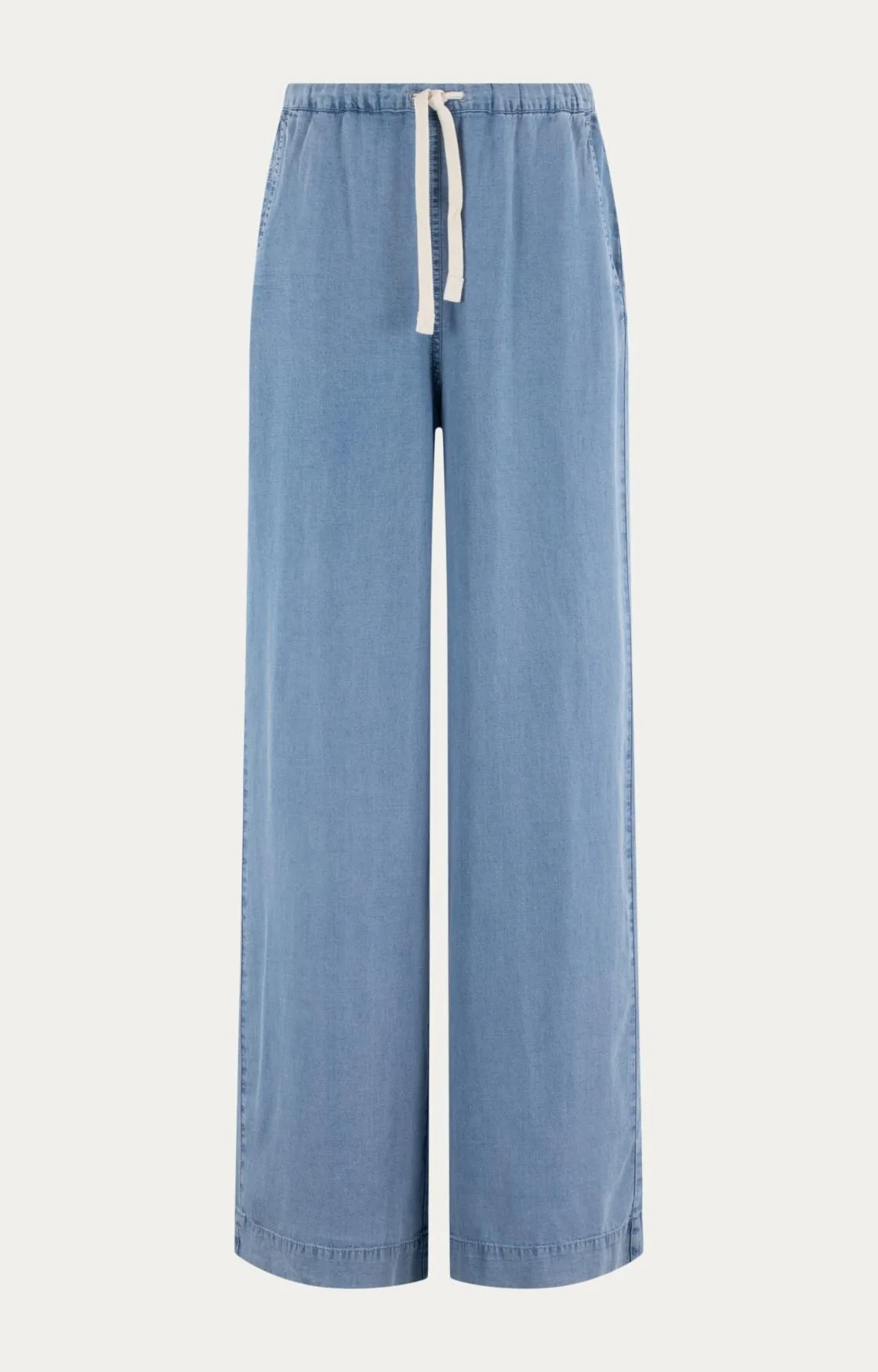 Jeans Barrow van Moscow is een jeans met casual pasvorm, elastische taille met koord en knoopsluiting, effen lichtblauwe wassing en wijde pijpen. Voor- en achterzakken bieden praktische ruimte, terwijl de soepele denim comfortabel meebeweegt voor een relaxte uitstraling.