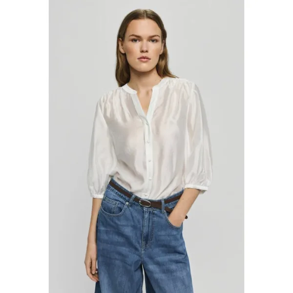 Deze elegante blouse is gemaakt van een lichtgewicht stof met een subtiele glans die soepel valt. Het ontwerp is voorzien van een vrouwelijke V-hals, een knoopsluiting aan de voorkant en zachte plooitjes op de schouders voor een verfijnde en moeiteloze uitstraling. De 3/4-mouwen zijn afgewerkt met een lichte elastische boord, waardoor de blouse geschikt is voor zowel dagelijks gebruik als meer geklede gelegenheden. Het model is 181 cm lang en draagt maat S. Pasvorm: Regular fit Halslijn: V-hals Mouwlengte: 3/4-mouwen Kleur: egret Materiaal: 78% TENCEL™ Lyocell & 22% Polyamide.