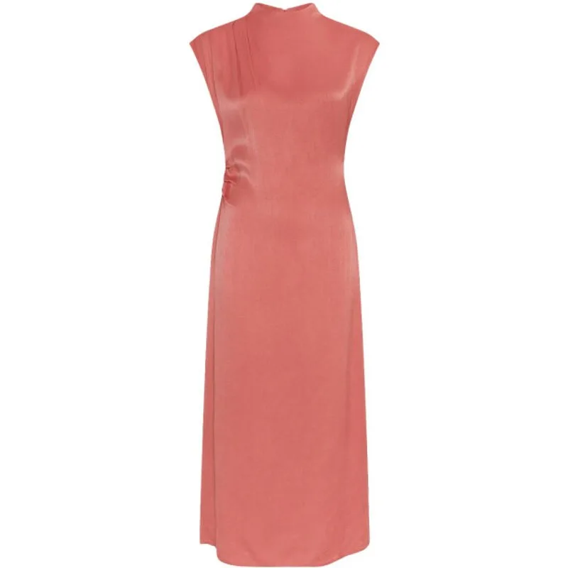 Lange jurk van een gladde stof met een subtiele glans. Ontworpen met een ronde halslijn en korte kapmouwtjes. Gedrapeerde details bij de taille zorgen voor vorm en structuur. Recht silhouet met een zijsplit en een verborgen ritssluiting aan de achterkant. ModelmaatHet model is 178 cm lang en draagt maat S. PasvormNormale pasvorm. LengteLange lengte. MouwlengteKorte mouwen.Kleur: faded rose Materiaal: 100% Viscose