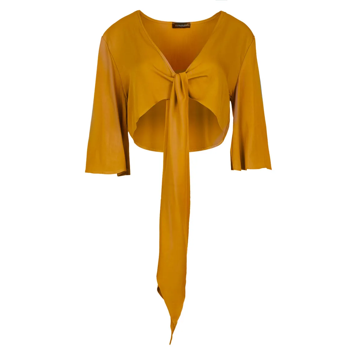 Deze mosterdkleurige bolero top is gemaakt van geweven viscose stof. Het heeft een croise-dessin met bandjes in dezelfde stof die in het midden onder de buste worden geknoopt. Het heeft ¾ klokkende mouwen. Deze top is perfect om dagelijks te dragen, maar ook voor avondjes uit over een jurk of een broek met hoge taille en rokken.