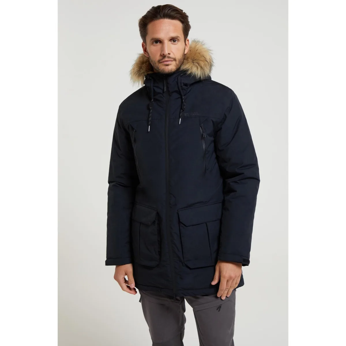 Voering: Contrast, gewatteerd. Vulling: Dons, Microvezel. Ontwerp: Logo, Tekst. Stoftechnologie: Ademend, Warmtebehoud, Isolerend, Waterdicht. Halslijn: Kapitein. Manchet: Haak en Lijn Riem. Mouwtype: Met lange mouwen. Getapete naden. Eigenschappen capuchon: afneembare rand van imitatiebont, koord, ingegroeide capuchon. Zakken: 2 borstzakken, rits, 2 voorzakken, klepsluiting. Bevestiging: Volledige ritssluiting. Waterdichte classificatie: 3000mm. 3000g/m²/24hrs. Koudebestendigheid (Celsius): -35°C. Duurzaamheid: Control Union CUC-890403, RDS gecertificeerd.