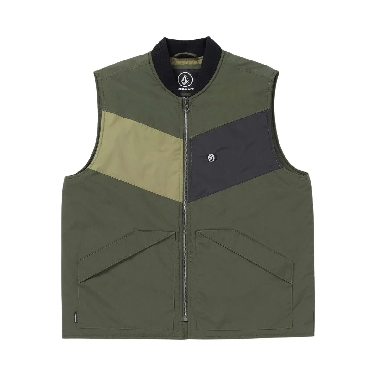 STOF 55% Nylon / 45% Katoen – Voering: 100% Polyester tafzijde afgezet met Polyester BESCHRIJVING Middelzwaar vest Normale pasvorm Ritssluiting aan de voorkant Gewatteerde voering Handzakken Binnenzak Volcom Borduursel op borst; vlaglabel op zak