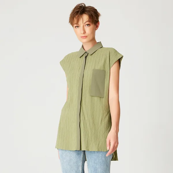 Een casual en androgyne look voor dit shirt gesneden uit een subtiele plooienstof. Een zeer trendy item dat kan worden verbeterd door een riem of losgelaten. Draag het over jeans of stop het in een meer formele rok met een kleermakersjas om naar het werk te gaan. Een chique en veelzijdig stuk, erg handig voor elke garderobe. Productdetails • Vorm: recht • Lengte: 72 cm • Mouwloos • Kraag • Midden voorgeknoopt