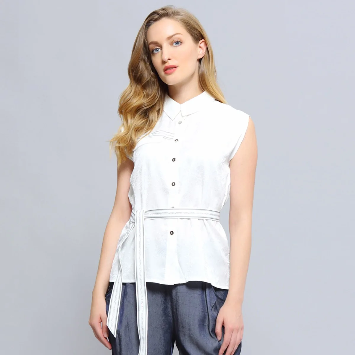 Moeiteloos en androgyne look voor dat shirt met een subtiele bloemenstructuur en ademende stof. Een zeer trendy item verbeterd met rijbers op de rechterborst en riem. Draag het bovenop een jeans of onze broekbeenbroek met achterste rokpaneel of stop het in een meer formele rok met een op kleermaker om aan het werk te gaan. Een chique en veelzijdig en basisitem, erg handig voor elke garderobe. Productengegevens • Vorm: recht • Lengte: 60 cm • Mouwloos • Kraag • Midden voorgeknoopt